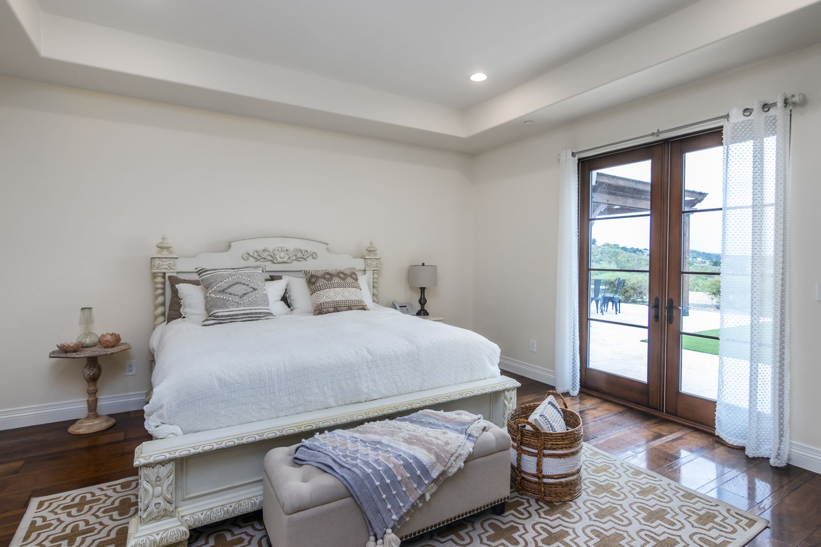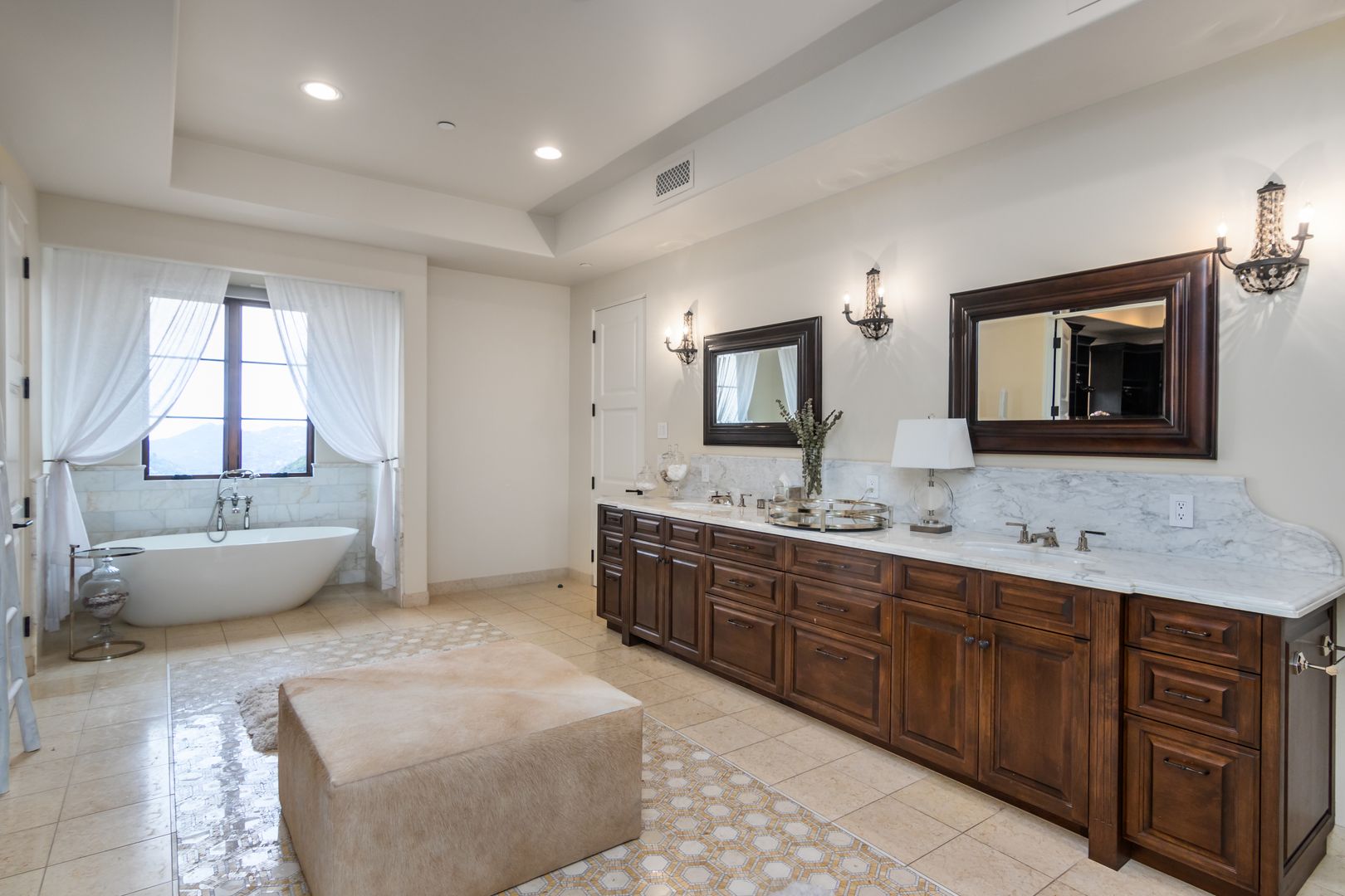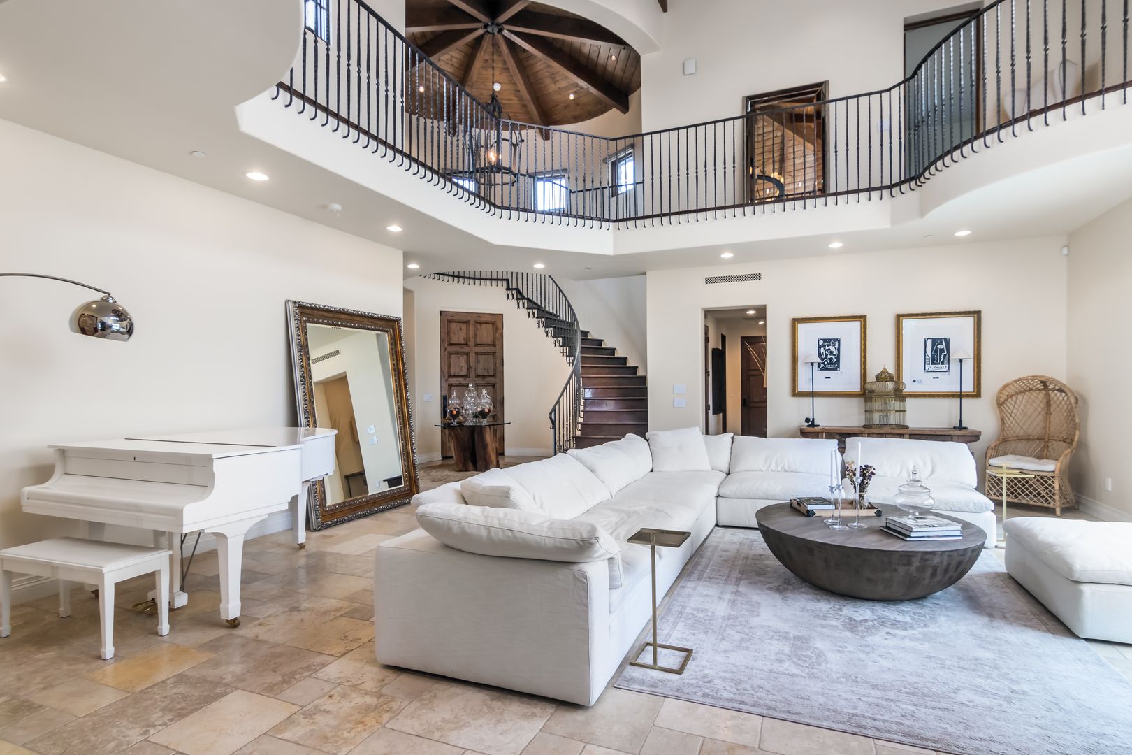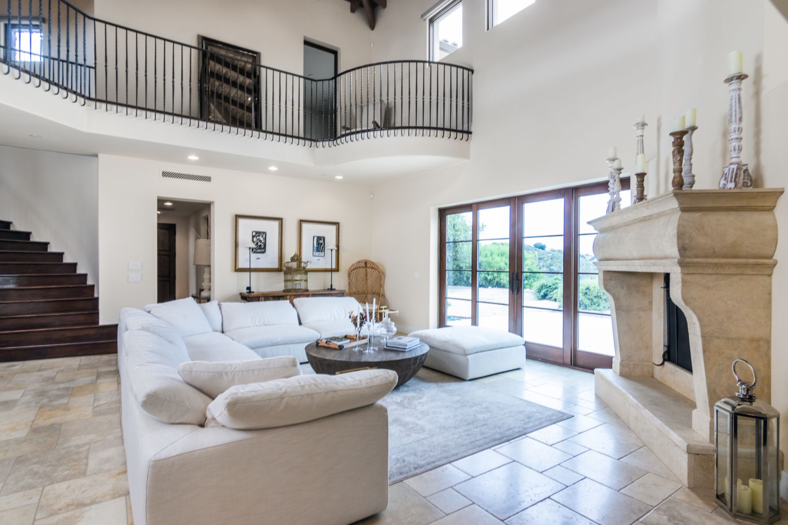 To step inside this estate is to feel transported. The 6,000-square-foot residence opens with drama and grace, a sweeping staircase beneath soaring ceilings, sunlight catching on Alder wood and architectural curves. Every space is designed not just to be lived in, but to be savored. The chef’s kitchen becomes the heart of connection, where Subzero and Wolf appliances meet fine wines chilled in your private cooler. French doors invite you onto patios where the air feels lighter, the views infinite.