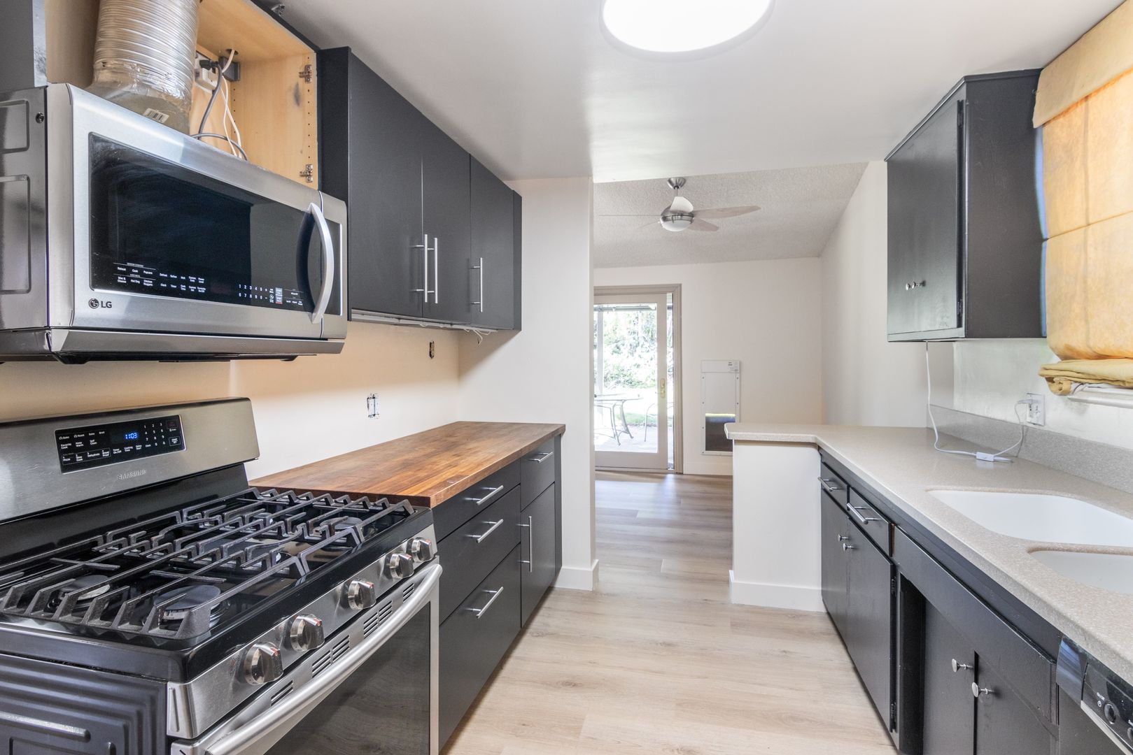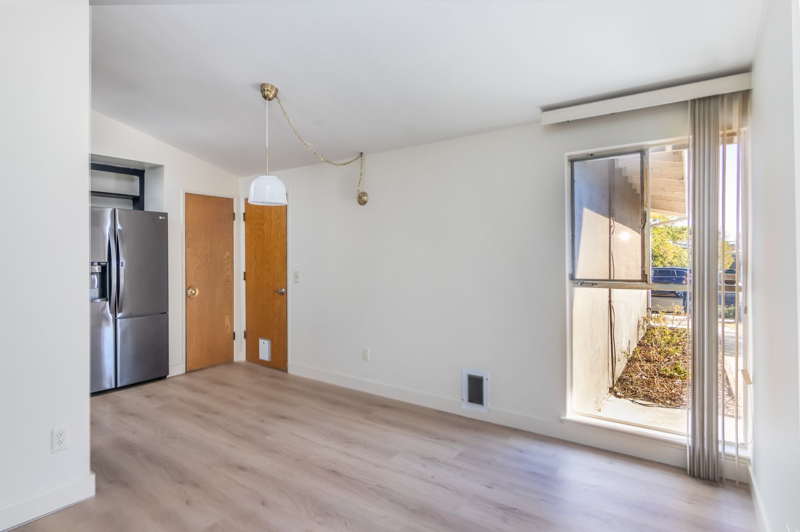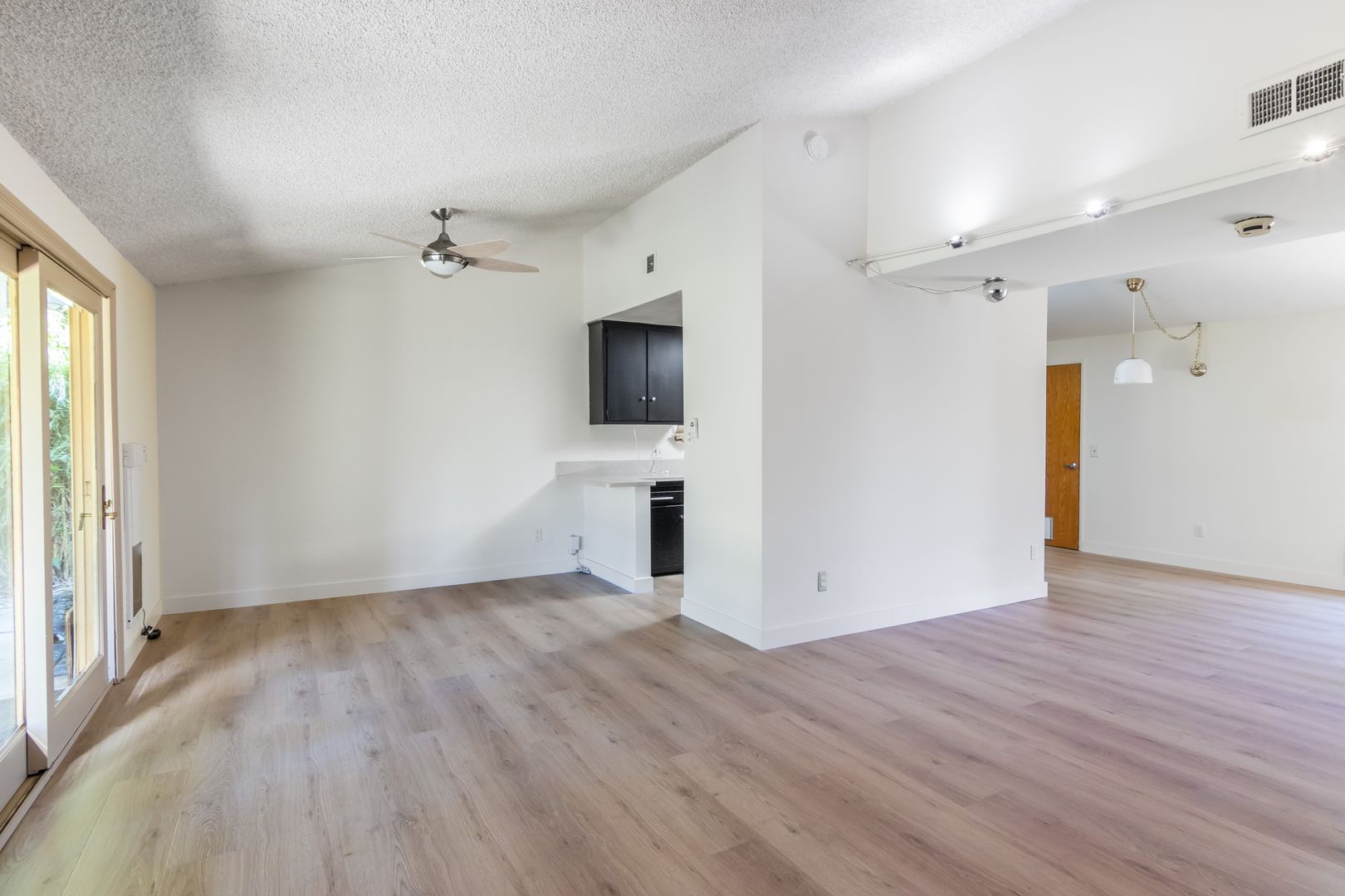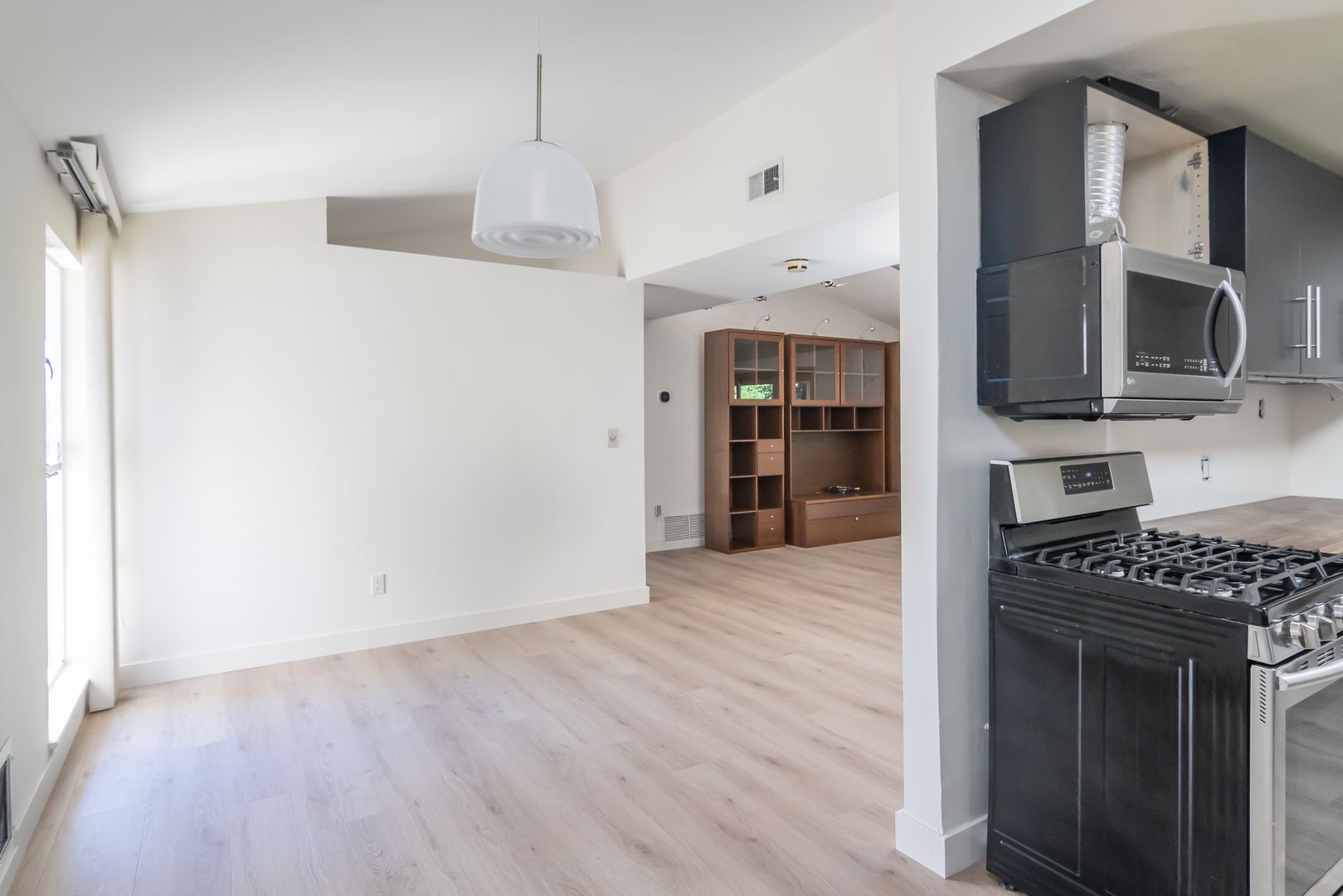 This inviting 3-bedroom, 2-bath home offers comfort and style with new flooring throughout and fresh interior paint. The spacious living room features high ceilings, a cozy fireplace, and a built-in entertainment center, creating a warm and open atmosphere. The dining area is conveniently located next to the kitchen, perfect for everyday living and entertaining. Additional highlights include an attached garage with washer and dryer included, as well as a private backyard with a covered patio—ideal for relaxing or outdoor gatherings.