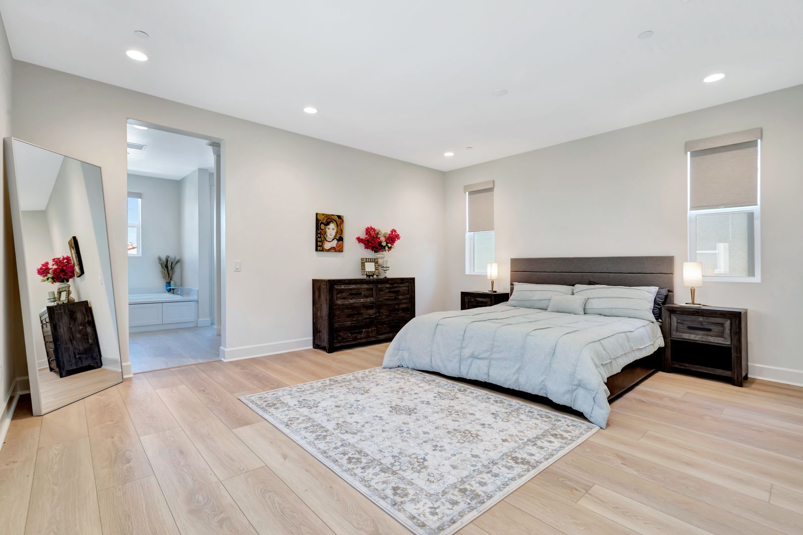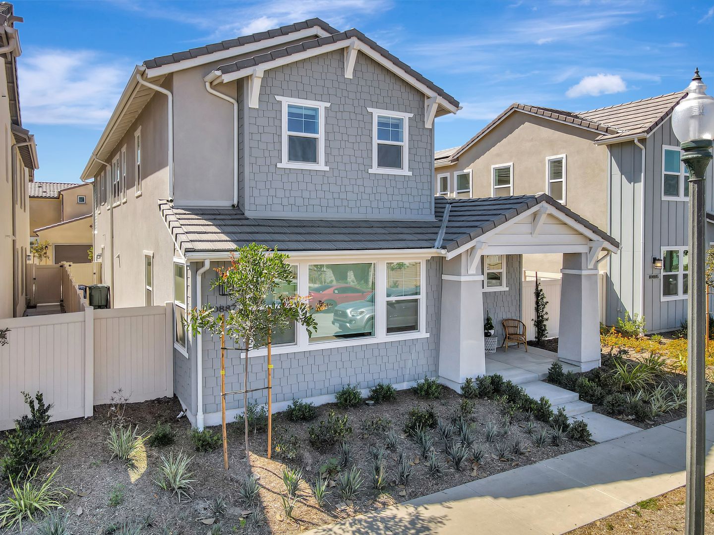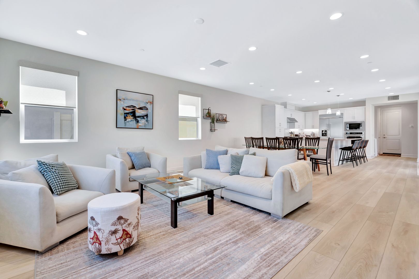 This beautifully crafted new-construction two-story home offers 4 spacious bedrooms and 3.5 bathrooms, seamlessly blending modern comfort with thoughtful design. The first floor features an open, light-filled layout with numerous windows that create a bright and welcoming atmosphere. At the heart of the home is a chef’s dream kitchen, complete with built-in appliances, a large island with seating, a fully functional setup, and a separate dining area ideal for both everyday living and entertaining. Also on the main level are a convenient half bath for guests and a full primary bedroom with a private en-suite bathroom. Upstairs, the home continues to impress with two additional bedrooms sharing a full bathroom, a generous laundry room equipped with a brand-new washer and dryer, and a spacious open family/playroom. A second, massive primary suite on this level includes a dedicated gym area, a spa-inspired bathroom with a soaking tub, separate standing shower, double vanity, and a large walk-in closet. Outside, the paved side yard offers a shaded sitting area and low-maintenance, drought-tolerant landscaping. Additional highlights include a two-car garage, solar power for energy efficiency, and access to a community pool and spa just five minutes away. Offered furnished but can be unfurnished.