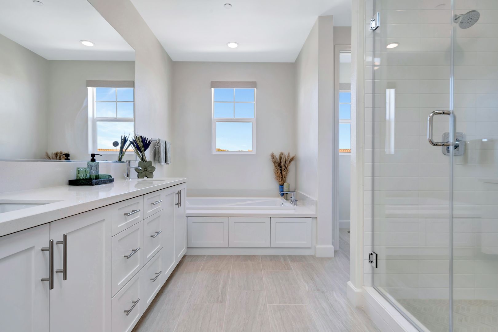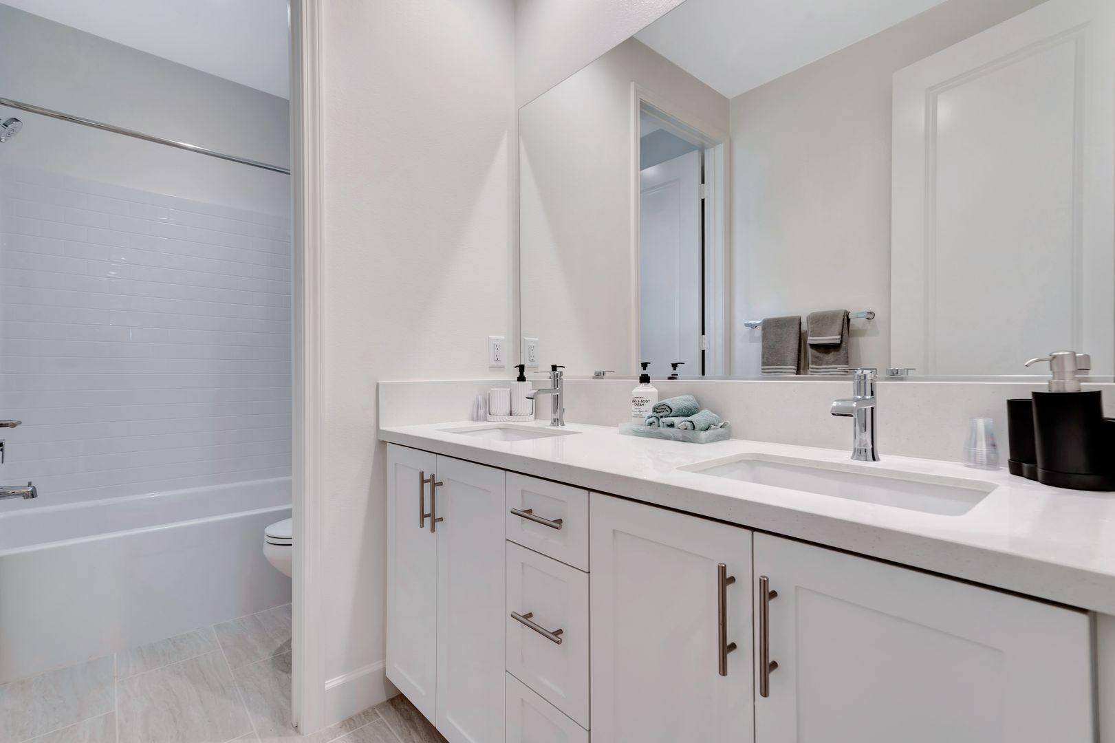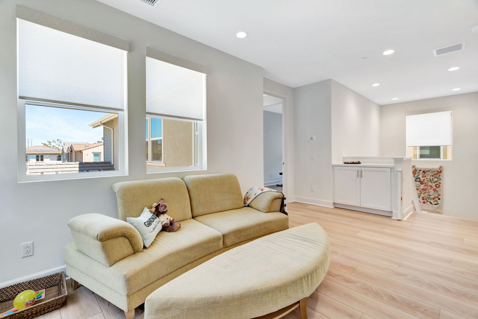 This beautifully crafted new-construction two-story home offers 4 spacious bedrooms and 3.5 bathrooms, seamlessly blending modern comfort with thoughtful design. The first floor features an open, light-filled layout with numerous windows that create a bright and welcoming atmosphere. At the heart of the home is a chef’s dream kitchen, complete with built-in appliances, a large island with seating, a fully functional setup, and a separate dining area ideal for both everyday living and entertaining. Also on the main level are a convenient half bath for guests and a full primary bedroom with a private en-suite bathroom. Upstairs, the home continues to impress with two additional bedrooms sharing a full bathroom, a generous laundry room equipped with a brand-new washer and dryer, and a spacious open family/playroom. A second, massive primary suite on this level includes a dedicated gym area, a spa-inspired bathroom with a soaking tub, separate standing shower, double vanity, and a large walk-in closet. Outside, the paved side yard offers a shaded sitting area and low-maintenance, drought-tolerant landscaping. Additional highlights include a two-car garage, solar power for energy efficiency, and access to a community pool and spa just five minutes away. Offered furnished but can be unfurnished.
